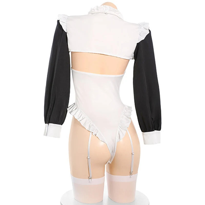 Made with curve-hugging, soft-stretch fabric, this bodysuit highlights your shape while teasing just enough to tempt. Featuring anime-style details and playful maid accents, it’s the perfect piece for stepping into a world of fantasy, fun, and forbidden allure.