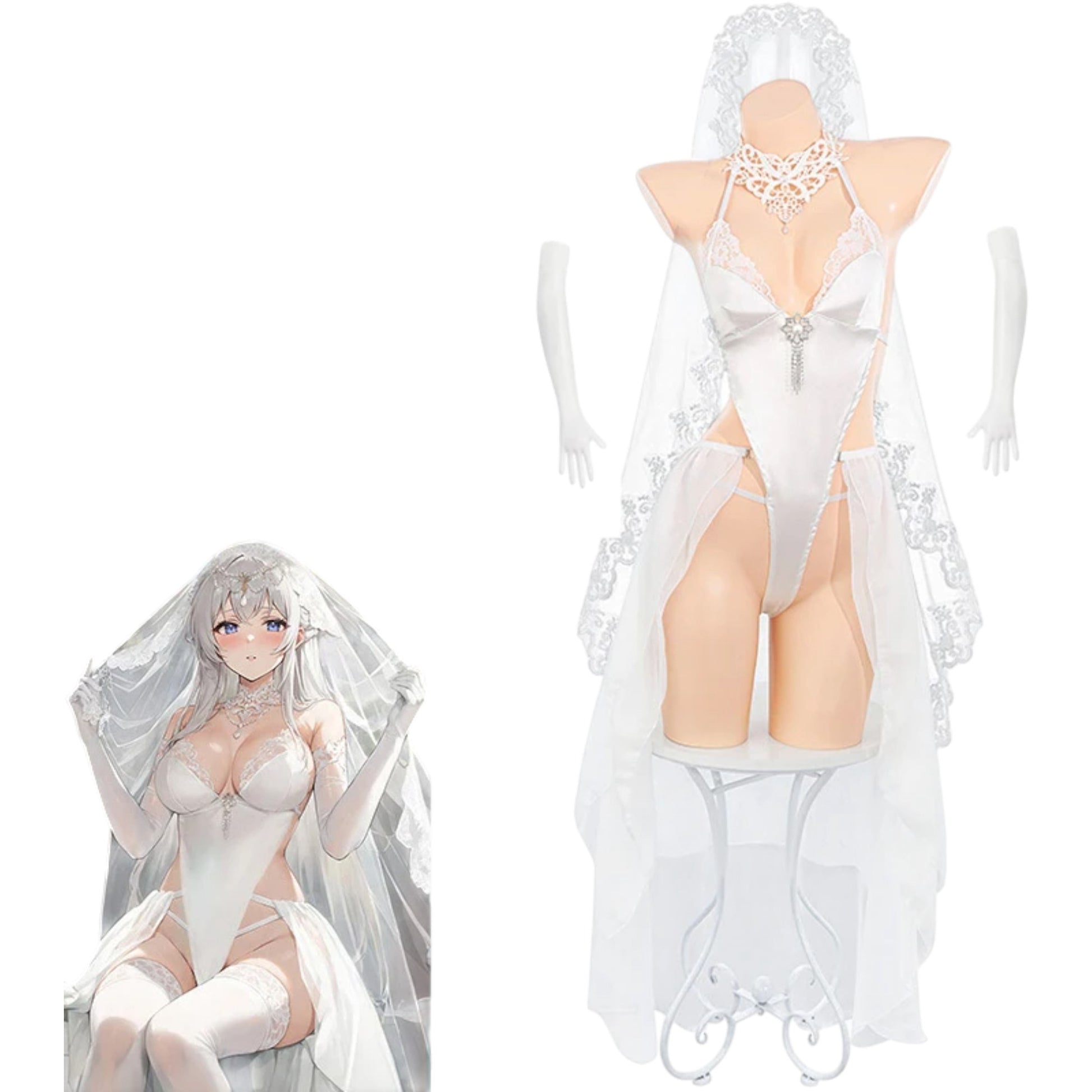 Sexy Anime Bride Costume – Women’s Lace Wedding Dress Bodysuit with Veil for Cosplay & Roleplay