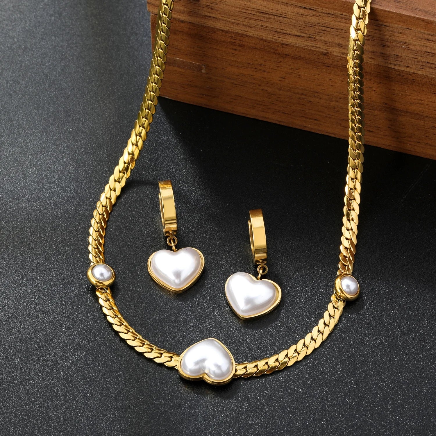 Add timeless charm to your collection with the Elegant Pearl Heart Jewellery Set, a beautifully coordinated ensemble for women. Crafted from durable stainless steel, this set features a delicate heart-shaped pendant adorned with lustrous pearls, complemented by matching earrings and a refined chain bracelet. Designed to drape gracefully along the neckline and wrist, it combines classic elegance with modern style, making it perfect for daily wear or special occasions. This versatile set also makes a thoughtful gift, offering a sophisticated way to celebrate love, style, and femininity.